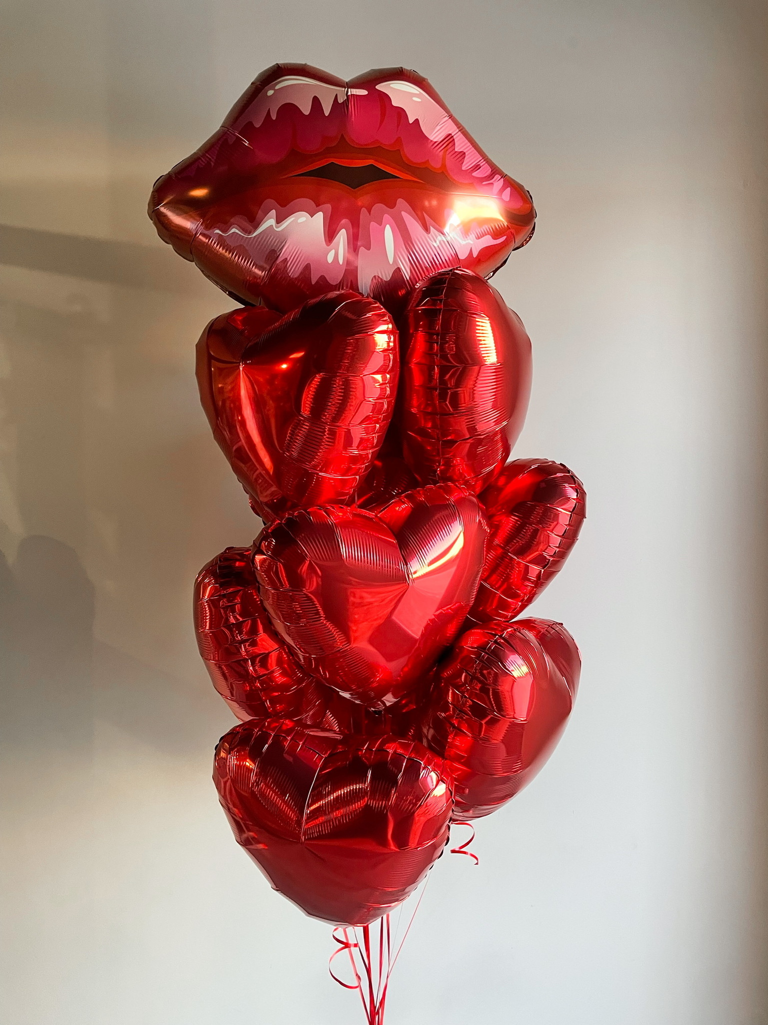- Фонтан из 10 шаров: Фигура Губы и 9 сердец 45 см.