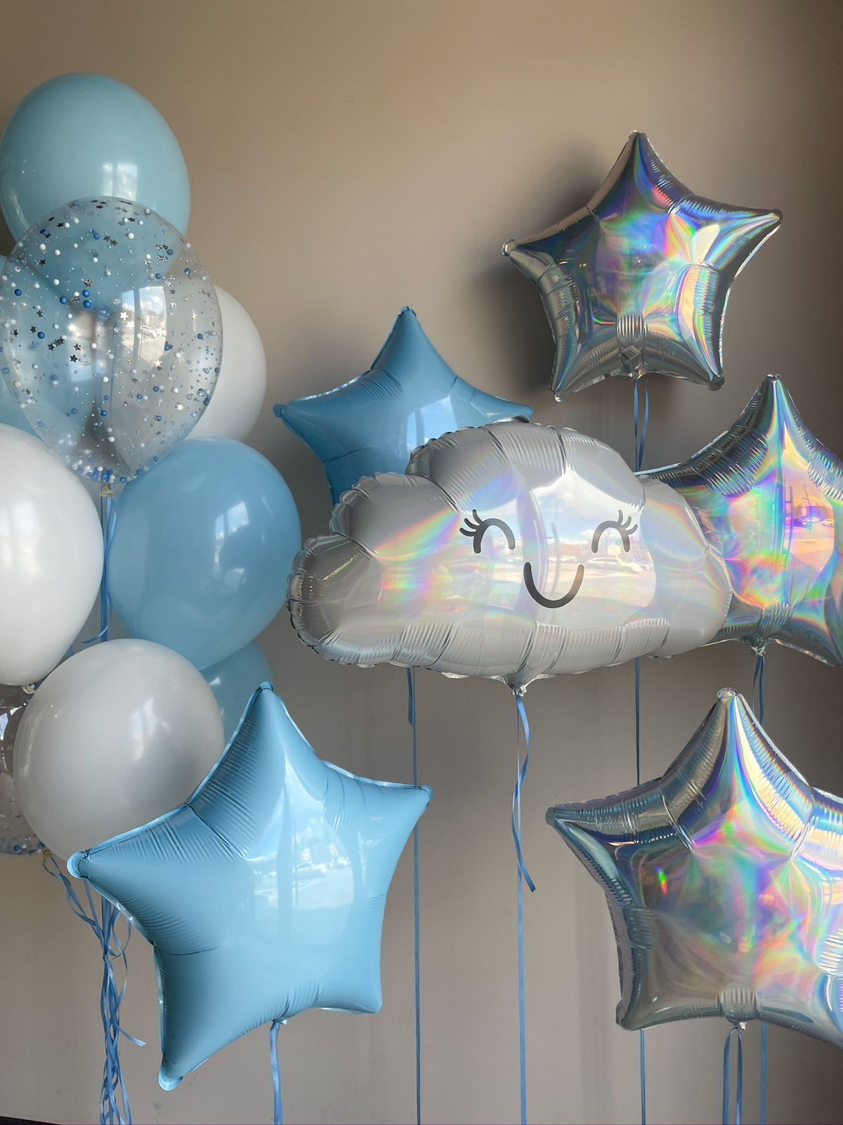 • Фонтан из 10 шаров (4 голубых, 4 белых, 2 прозрачных с конфетти)