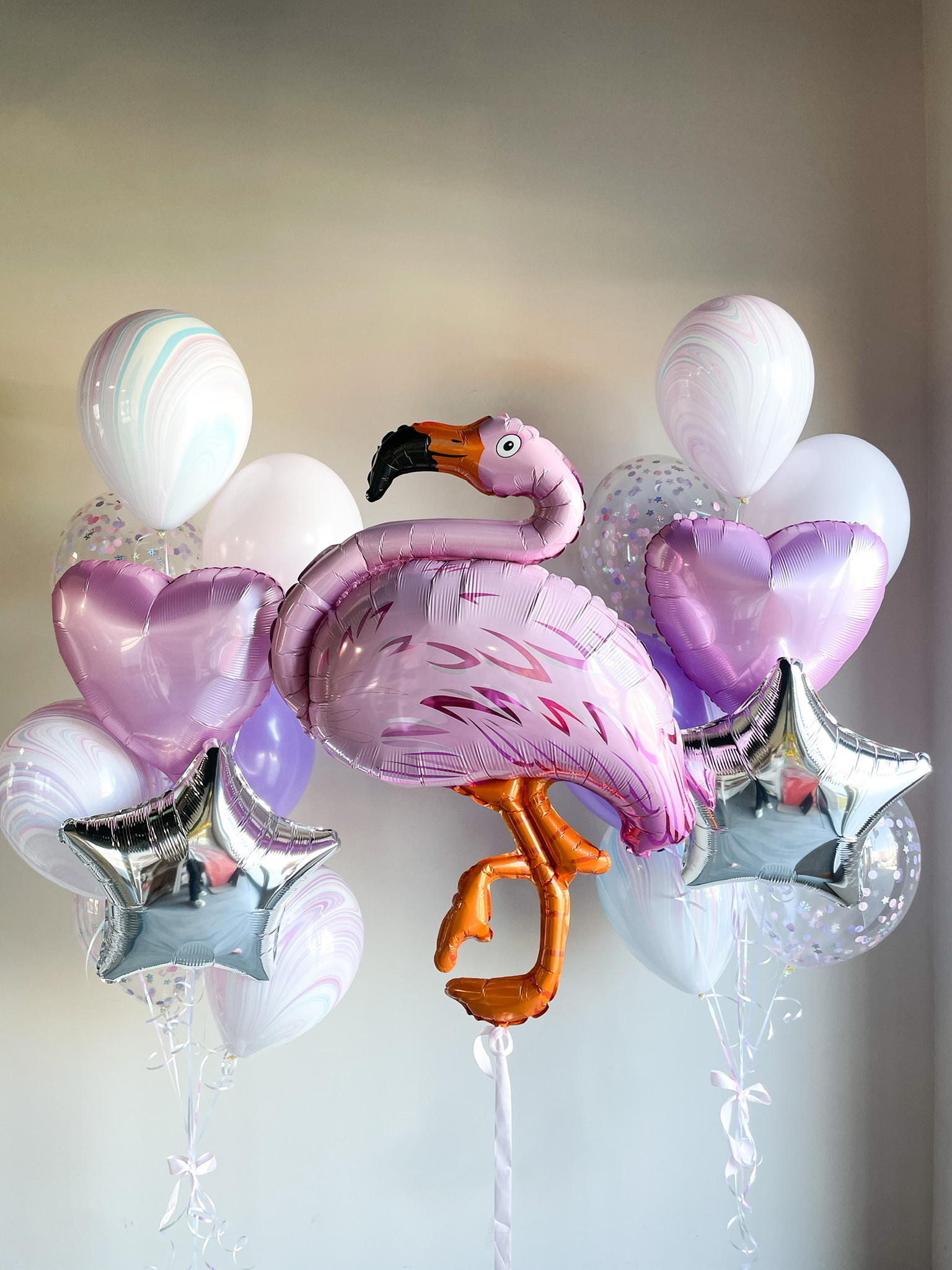 - Два фонтана из 9 шаров: сердце, звезда, 3 агата, 2 с конфетти, 2 однотонных