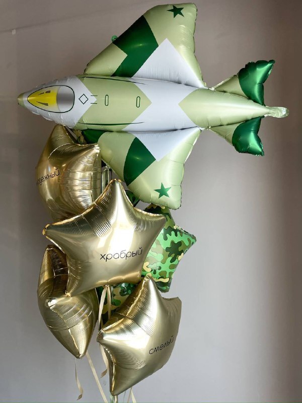 Фонтан из 4 звезд камуфляж и 4 звезд с надписью, самолет