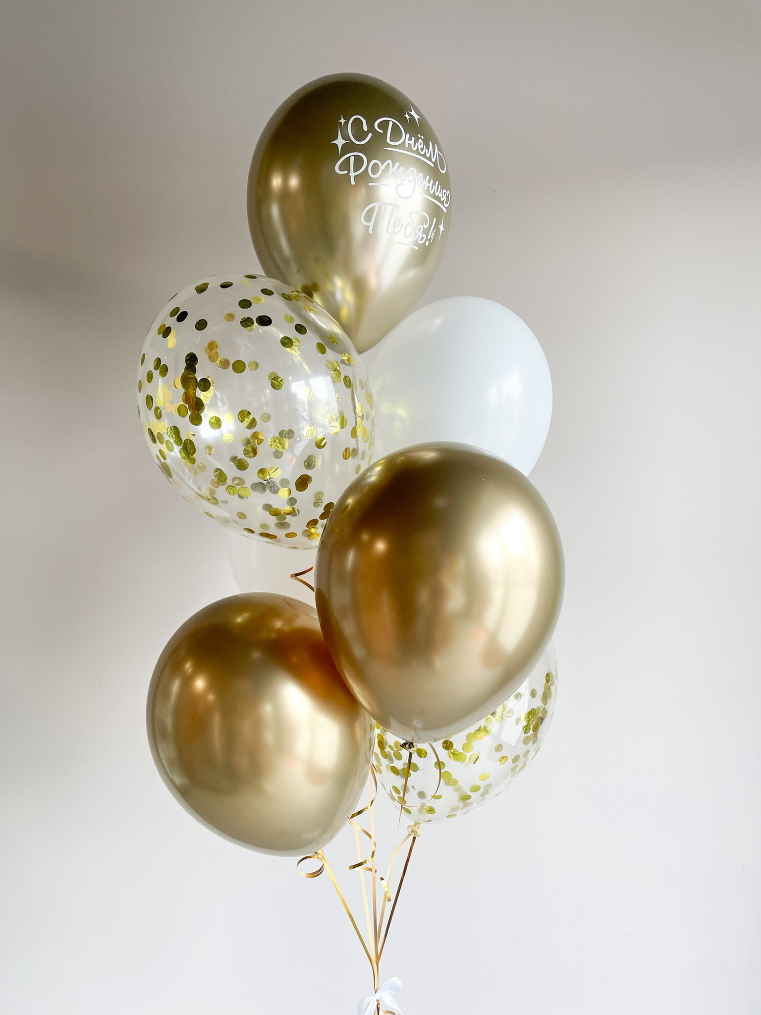 - Фонтан из 7 шаров: хром с надписью, 2 с конфетти, 2 хром, 2 однотонных