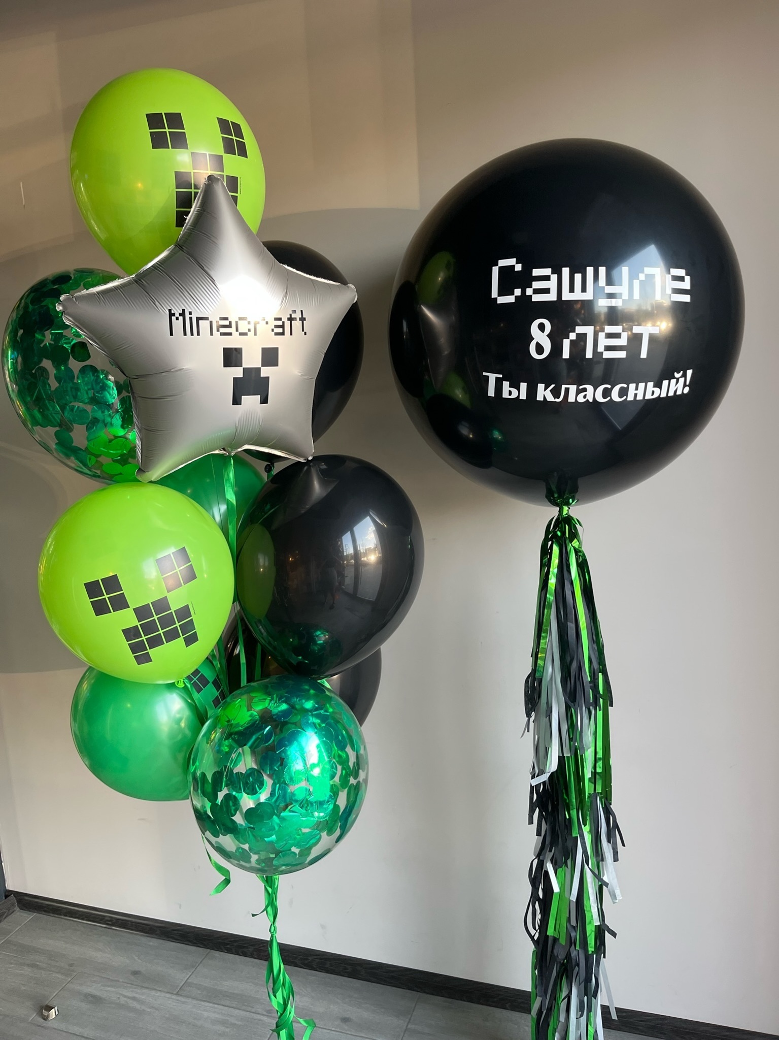 Фонтан из 10 шаров на атласных лентах (2 с конфетти (возможна замена), 2 пиксели, звезда с надписью, 5 обычных)
