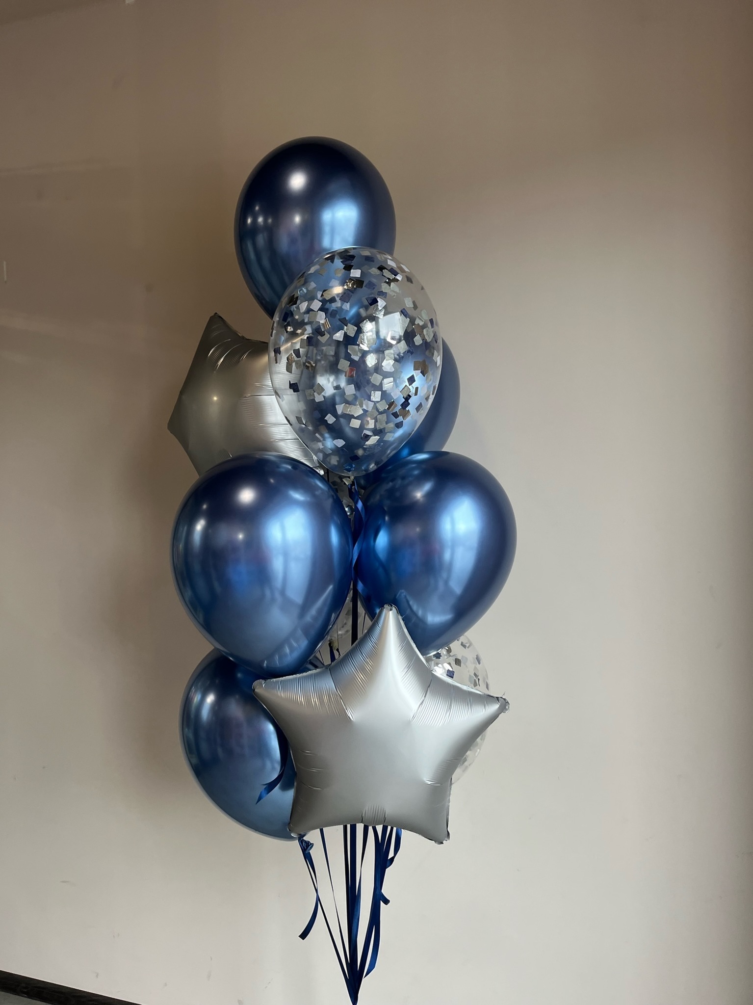 Фонтан из 10 шаров на атласных лентах (3 с конфетти, 2 звезды, 5 хром)