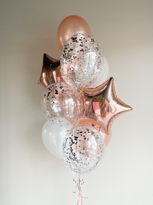 - Фонтан из 10 шаров: 2 звезда, 3 с конфетти и 5 однотонных