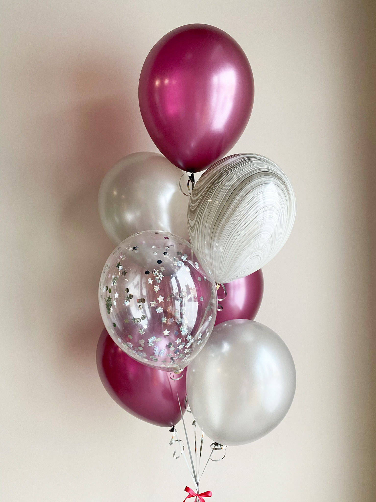 - Фонтан из 7 шаров: 1 с конфетти, 1 агат, 3 хром и 2 однотонных.
