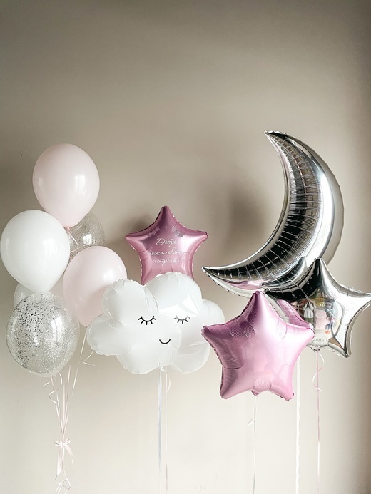 • Фонтан из 6 шаров (2 розовый макарунс, 2 белых, 2 прозрачных с конфетти)