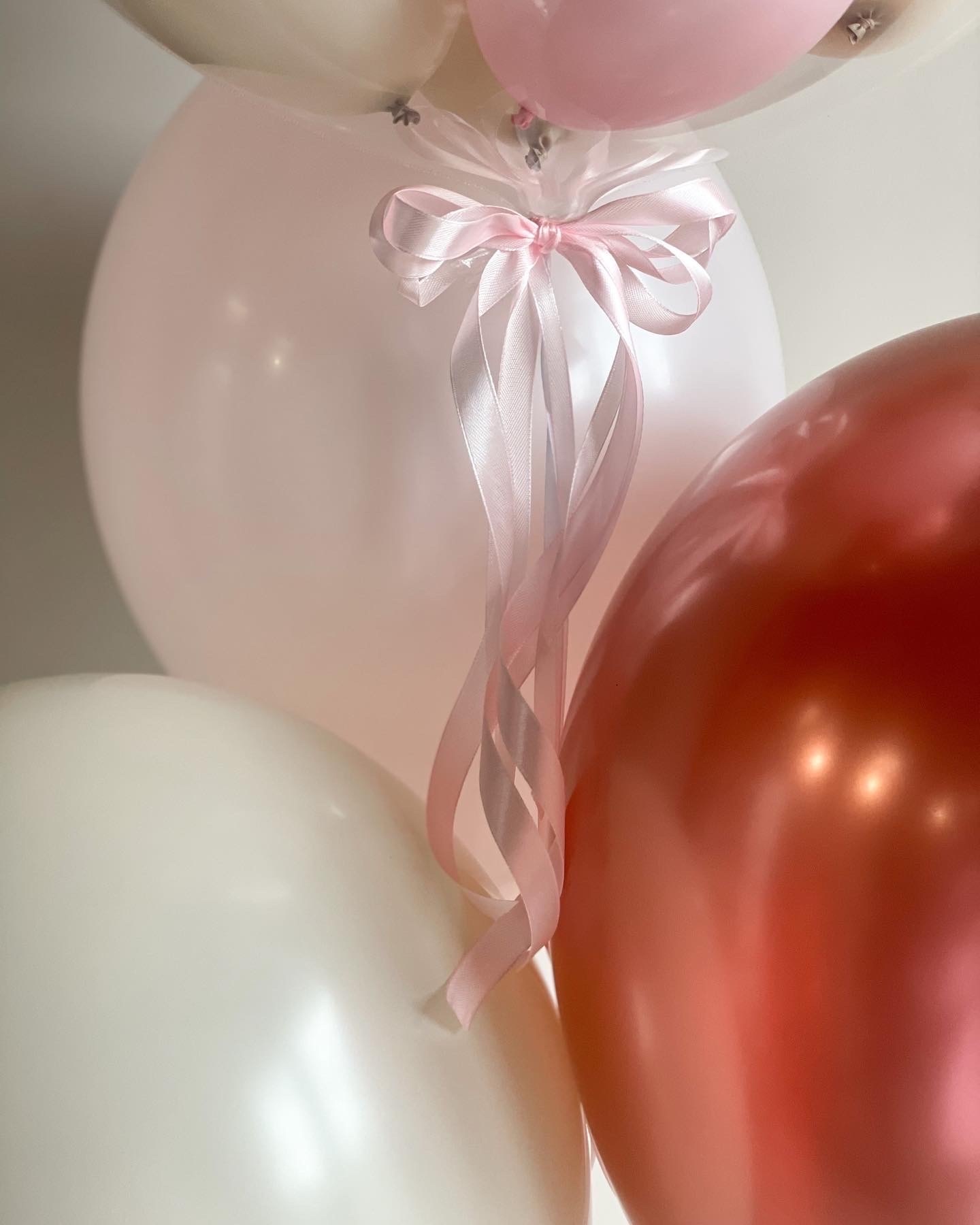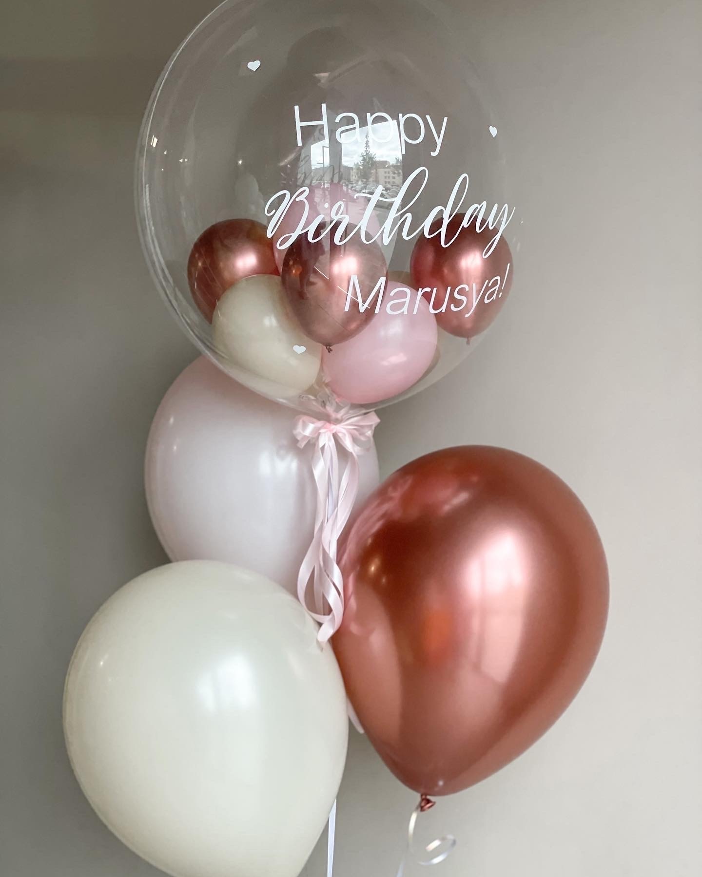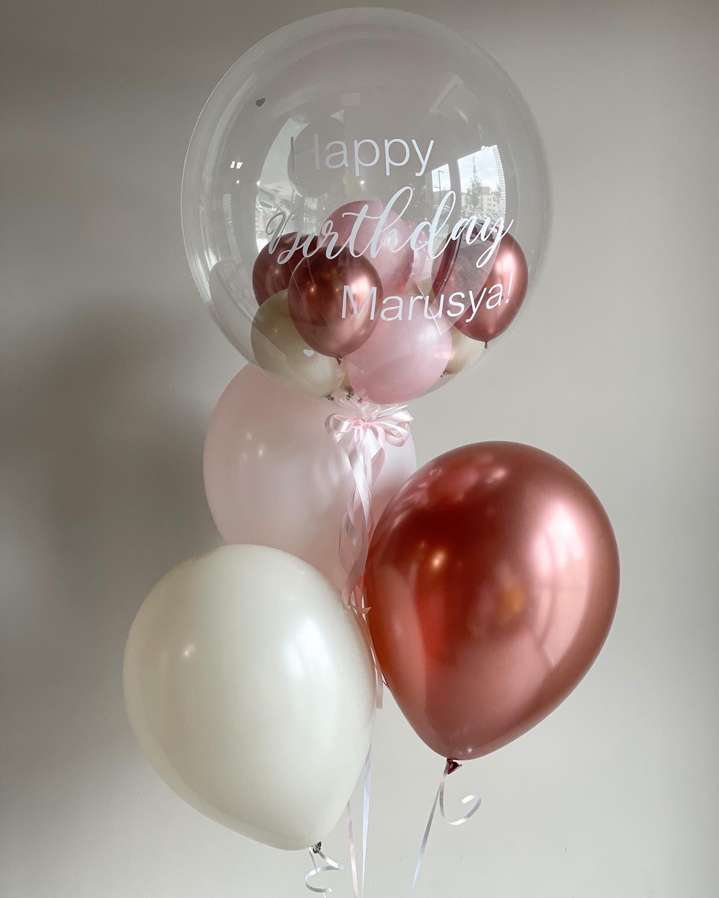 - Фонтан из 4 шаров: Шар бабл с наполнением и надписью, 1 хром и 2 однотонных.