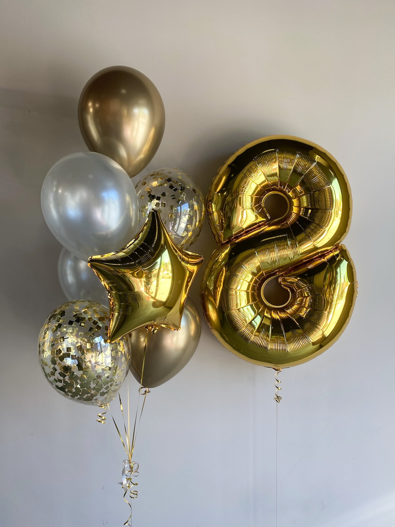 - Фонтан из 7 шаров: звезда, 2 с конфетти, 2 хром и 2 однотонных