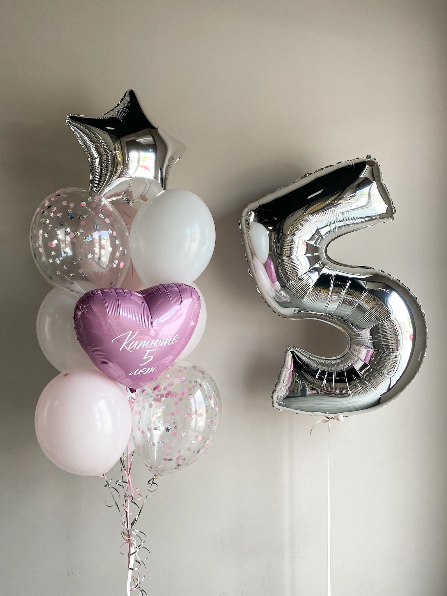 - Фонтан из 10 шаров: сердце с надписью, звезда, 2 с конфетти, 6 однотонных
