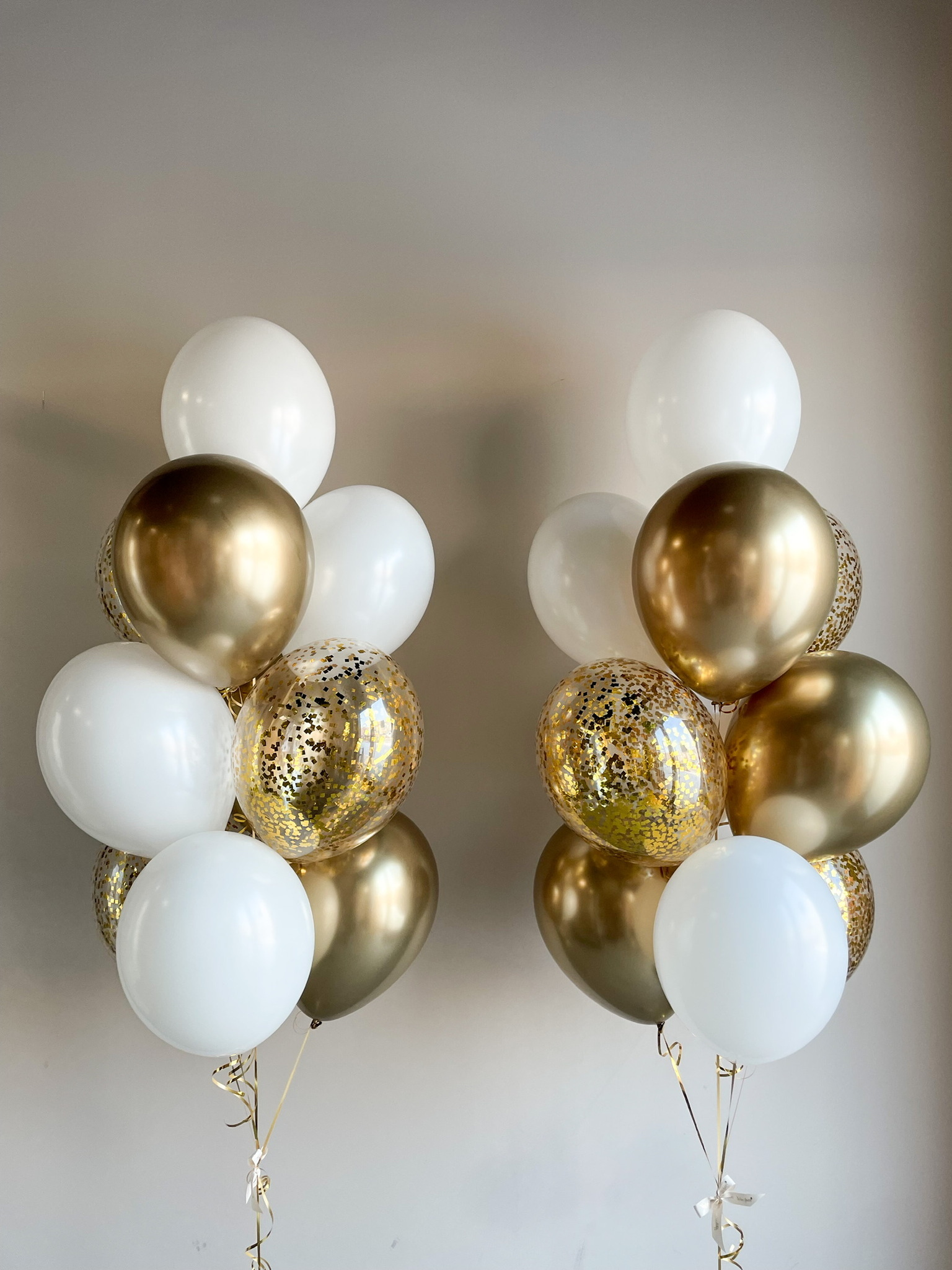 • Два фонтана из 10 шаров (3 с конфетти, 3 хром золото, 4 белых)